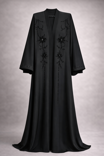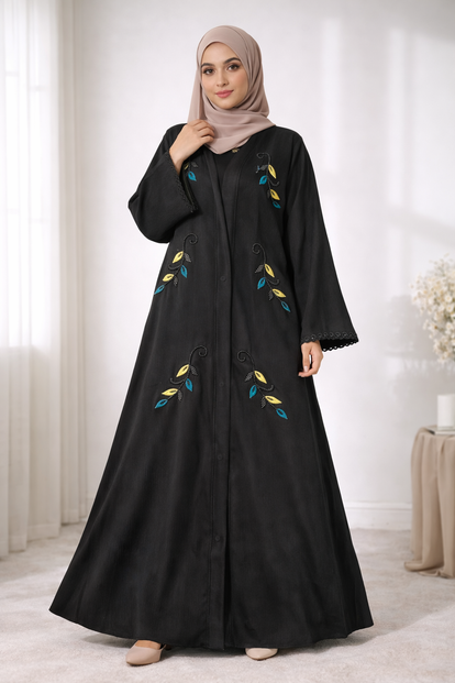 This elegant black abaya is crafted from premium Nida fabric, known for its soft texture, lightweight feel, and graceful drape. It features delicate hand-worked embroidery along the front, adding a subtle touch of sophistication and luxury. Designed for comfort and timeless style, this abaya is perfect for both everyday wear and special occasions