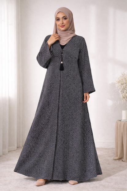 A modest, flowing abaya made from Primat fabric, featuring a subtle black-and-white pattern and a comfortable, lightweight feel. Designed for everyday elegance and effortless wear.