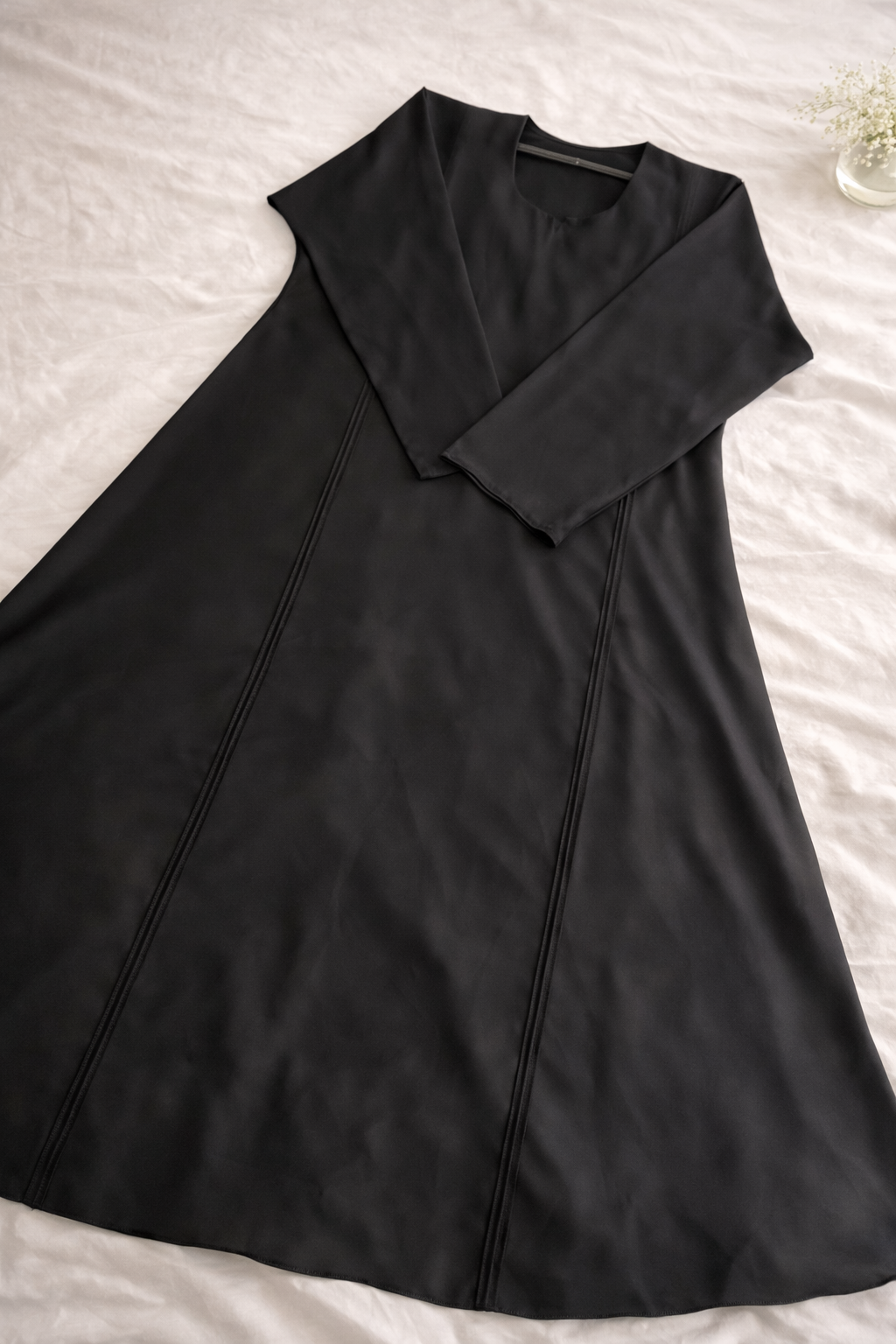 A timeless black abaya featuring a modest, flowing silhouette. Made from Nida Fabric (Lightweight Nida) for comfortable all-day wear. Perfect for everyday elegance and versatile styling.