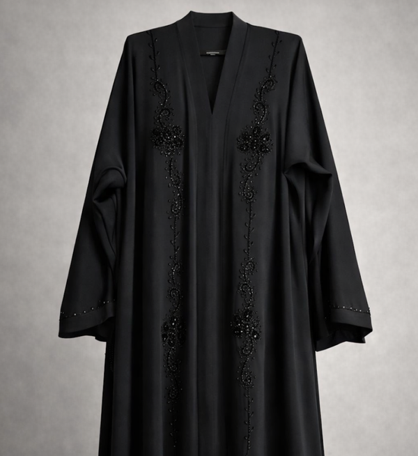 This elegant black abaya is crafted from premium Nida fabric, known for its soft texture, lightweight feel, and graceful drape. It features delicate hand-worked embroidery along the front, adding a subtle touch of sophistication and luxury. Designed for comfort and timeless style, this abaya is perfect for both everyday wear and special occasions.